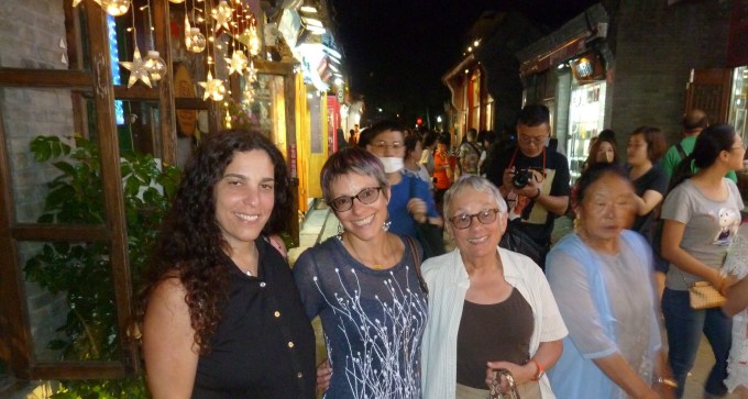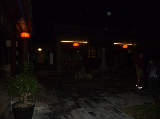Reading over that post from last night with a cup of coffee this morning, I should make it clear that we DID finally successfully meet up with our friends Harriet and Janet. We walked around near their hotel, which is located right in these old Chinese hutongs, which are old alleyways that are teeming with people and shops and are so adorable. We then got to see their hotel, which is built out of a little 300 year old house, complete with an enclosed courtyard. I couln’t get any good pics as it was too dark but you can lookup up the hotel: Courtyard 7 in Beijing. In this city of 20 million people, here we all are below. And I’m posting the one poor pic of the courtyard just to give you some sense. I notice that Ron’s shoes glow in the dark…who knew?!