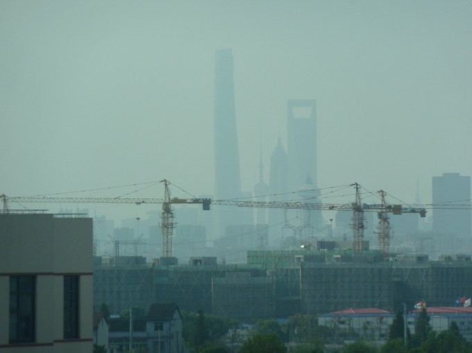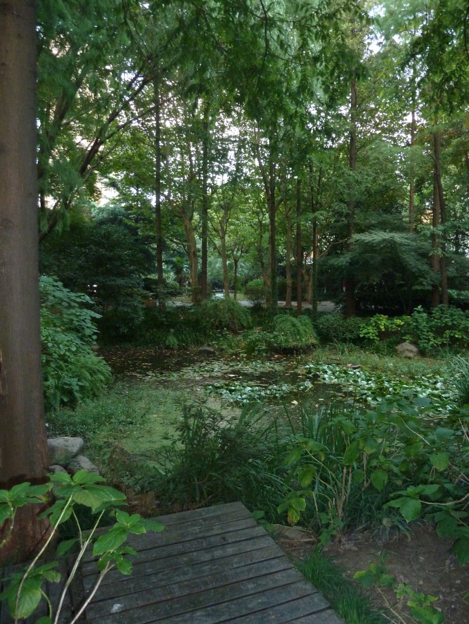 The air here is the dirtiest of the 3 cities. It’s pretty mind-boggling, especially since the city is so green and tree-lined, for China. But here’s the air as we drove in yesterday and yet, somehow, here’s a green park right next to our hotel: