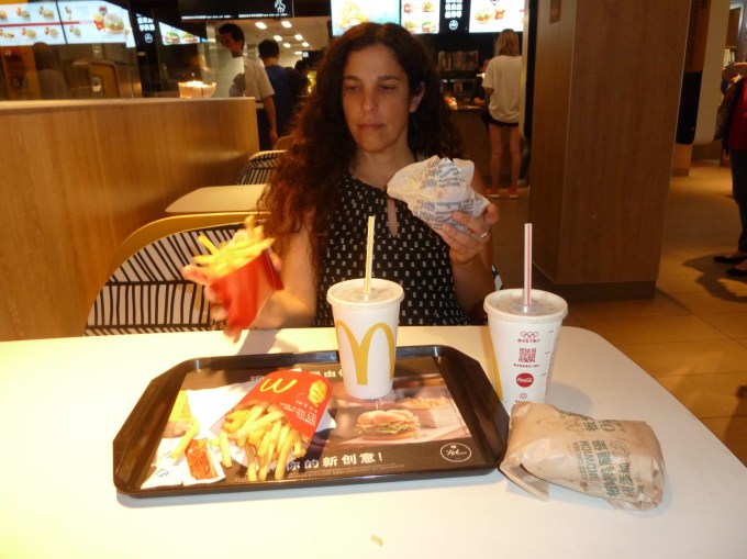 So you can only imagine my joy on the bus- and it was this very giddy feeling that buoyed my spirits and transported me through the litany of my other daily failures. First, we went to an art museum. Enough said. But then we got to “DO” some calligraphy art as a group and the teacher walked around the 18 of us, commenting on our work and she said good job, nice work etc. to everyone and then she got to mine and she said NO PROBLEM, which pretty well cemented my feeling that I am not an artistic creature. Then, at the Xi’an airport, continuing my quest for a Filet o Fish, I discovered that there was no American fast food at all and I had to have an ice cream bar for my lunch, supplemented by some Keebler crackers I brought from home. We hit Shanghai, though, and our fortunes turned as this place is the most modern and western city in China, and I say that in a positive and grateful way, and here we are at the McDonald’s trying (and failing) to place an order at the kiosk.