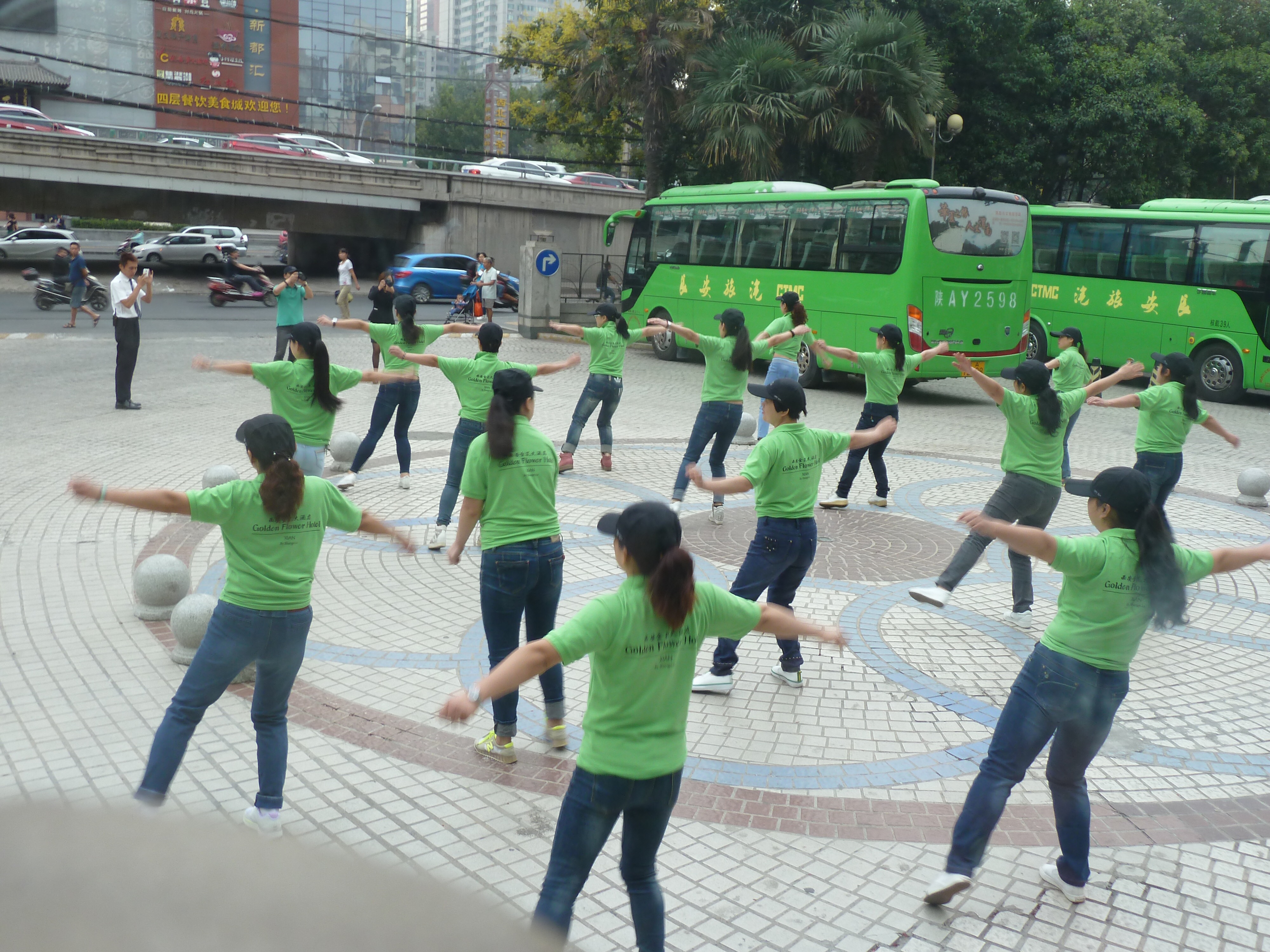We’re headed out for sightseeing in a bit, so there will surely be better pictures in my next post but I wanted to leave you with these. The first one is a pic I took on the bus as we left Xi’an. It’s some of the hotel’s housekeeping staff, all gathered and dancing in the parking lot because it’s something like World Housekeeping Day. There’s a funny group mentality thing here (hey! Communism!) that just makes me chuckle because, self-centered American that I am, I try to imagine a US company having success with some sort of morning exercise like this and I just cannot. Morning stretches in the Metro Mart parking lot??