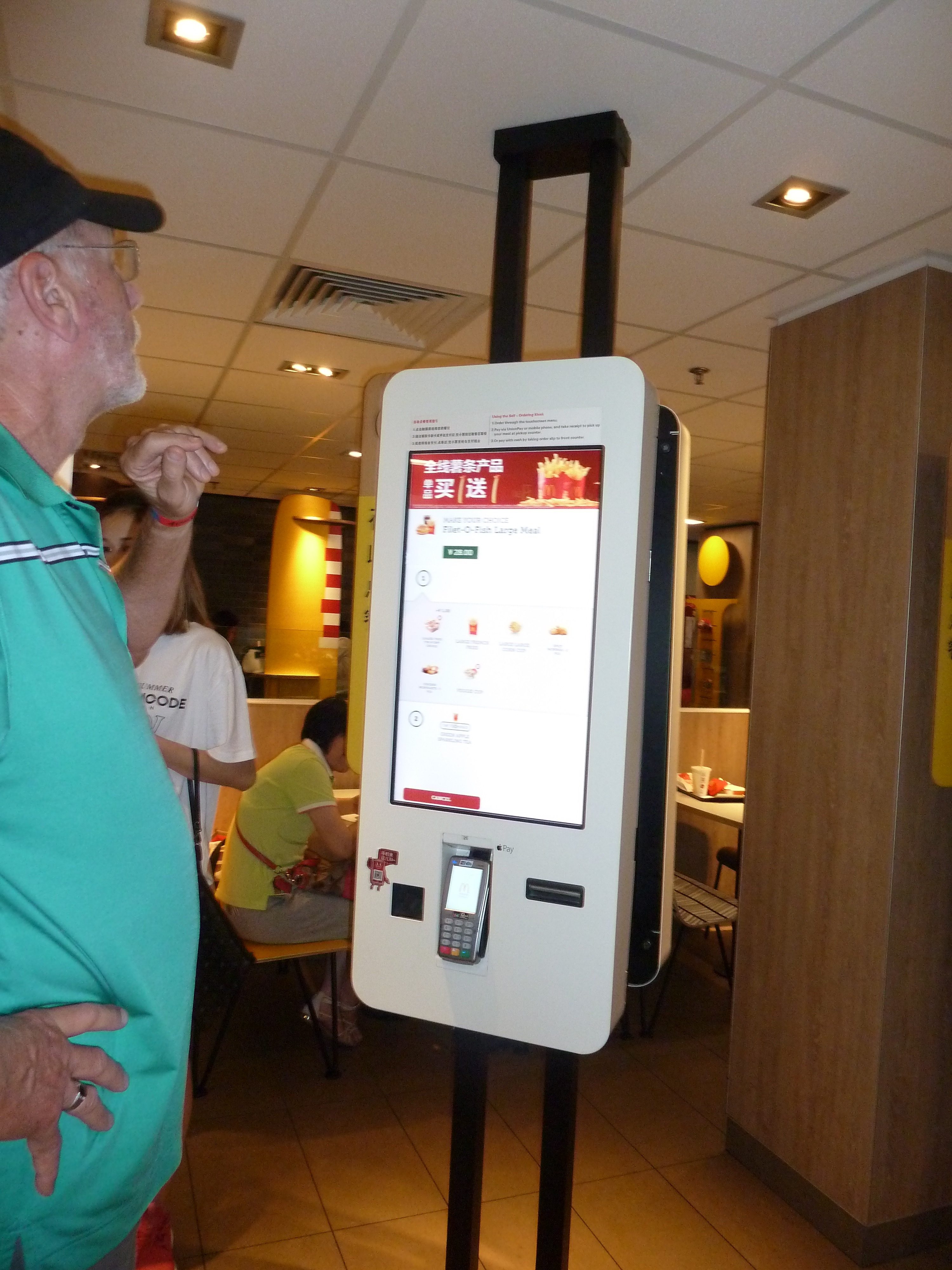 We spent about 10 minutes there trying to make it work, then moved to plan B, which was approach the cashier and look sad and hungry, which worked well as she handed us a picture menu so that I could just point to my Filet o Fish.
