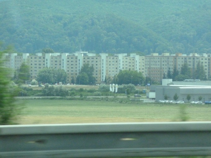 If you’re looking to tangle with the police in Europe, Slovakia should definitely be your destination. We had to traverse the north-south route of the country to get from Krakow to Budapest and we saw police on the side of the road constantly. Will was terrified of them, having been shaken down for a 100 Euro bribe last month (he craftily negotiated this down from 150 Euro) and his fear meant that he would not go one kilometer over the speed limit in a country where each and every town has a speed limit of 25mph and there are no bypass highways. It made for a long day. Here’s a couple of shots from the van en route, one of a Slovakian mountain town and one of a communist housing development.