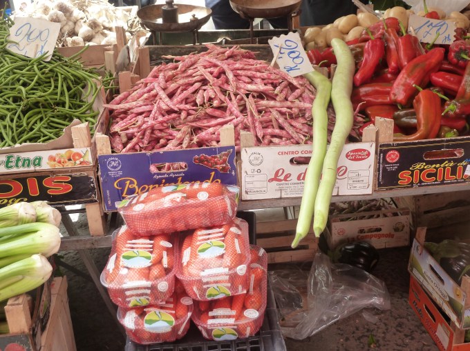 Here’s one more market shot – that long light green thing is a variey of zucchini and the red bean pods are fagioli beans.