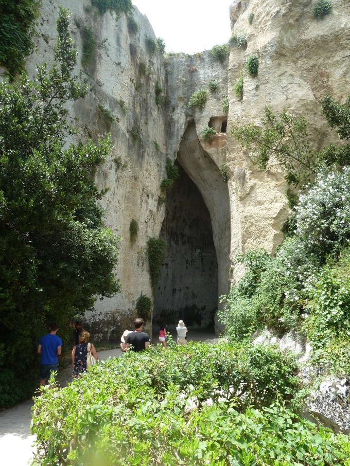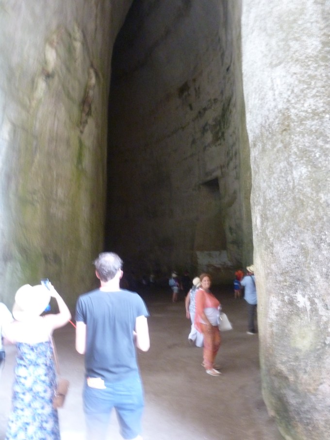 We toured a Greek theatre in Siracusa with a cave area that had fantastical sound echo properties, allowing Chiara to walk the length (60 meters?) of the cave away from us and sing. The echo carried her voice directly to us like she was standing a foot away. She sang something (Italian) and the entire cave applauded her. Here’s the cave site: