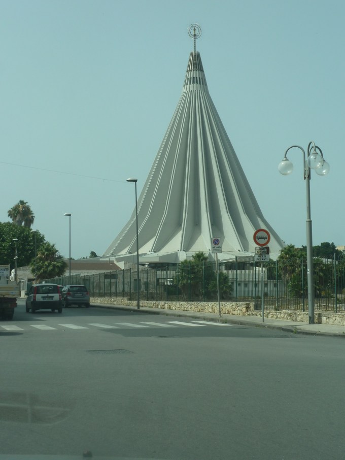 As we drove into Siracusa, marveling over the antiquity of it all, I spied this building in the distance. It looks like a spaceship readying for flight. Chiara told me that it’s a church and, at the end of the day, she agreed to take us over there and let us have a peek inside. I’ll let you draw your own opinions of it.