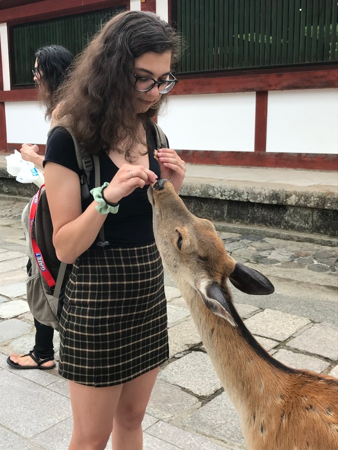 It’s all gorgeous, but I don’t think my troops cared anymore, generally. As you approach the temple, you need to walk through part of the Deer Park of Nara and that is what grabbed the attention of the young people in our group. Nara swarms (accurate descriptive verb award for me) with deer. There are thousands of them roaming around. Here’s one that Mikey decided to feed, which ate happily and then bit her when the food ran out.