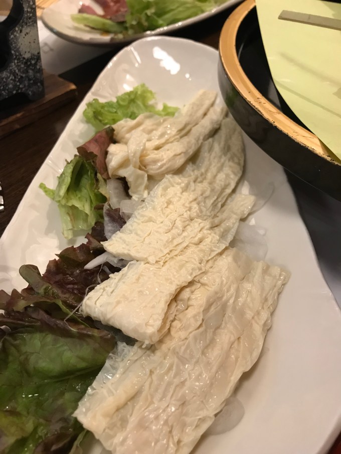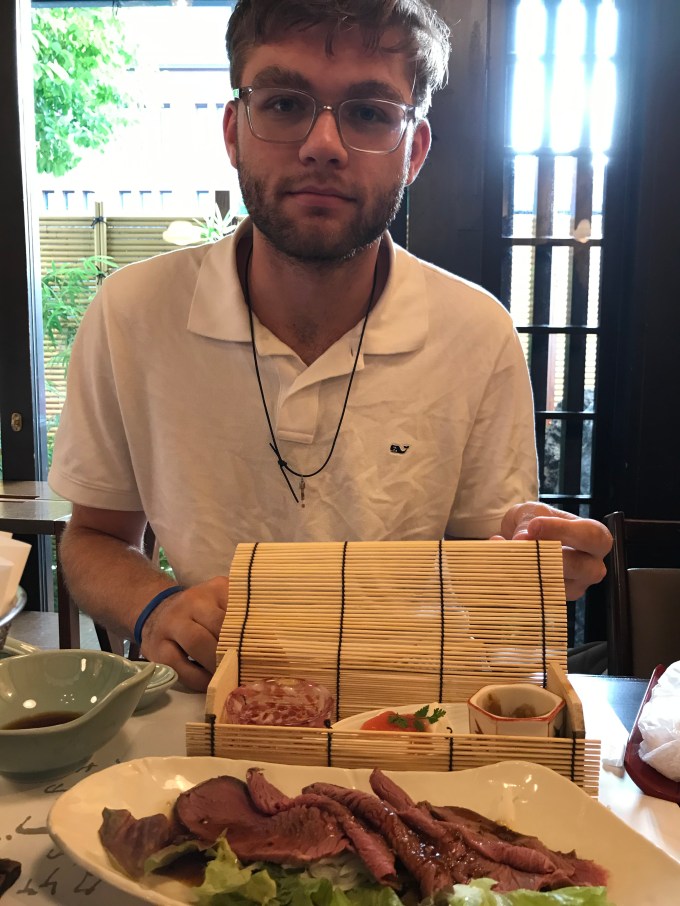 We finished off our Gate One tour with (one more!) special Japanese meal, this time with a Maiko dancer. I scored the highlight meal of my trip. Everyone else was presented with a variety of things that included these items below. Cooper is showing off some raw-looking beef that was apparently actually cooked. Down below that is something we asked Shizu about and we were informed that it is the skin scraped off the top of gelatinized soy milk. The Japanese must think long and hard about what kind of things they can creatively make food out of. I myself, healthy vegetarian type, was presented with a plate of French fries, some edamame and a bowl of rice, precipitating a lot of food envy from the surrounding tables.