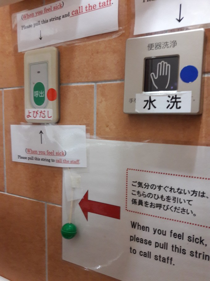 And here’s creepy signs they had in their bathroom. THREE different ways to call for help from one toilet? I was worried that they knew something about my digestive health situation that I was not aware of.