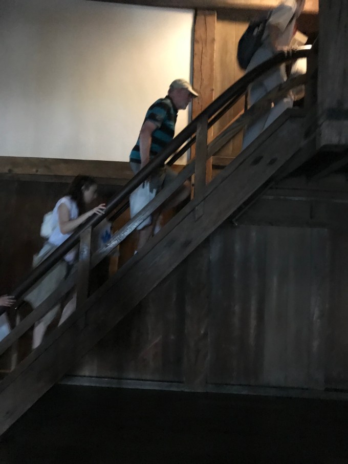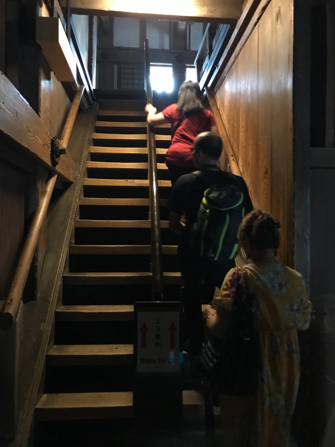 Himeji was interesting because it was so different from castles we’ve toured in Europe. European castles were lived in – they were residential and often filled with gorgeous antiques. Himeji castle was used as a defensive fortress. It sat basically empty and would only be used when the royal grounds were under siege. The rulers would flee to the top of Himeji Castle, through the entry maze, up the winding paths, and then finally up 6 flights of crazy dangerous stairs. I am shocked that no one in my group fell on the castle grounds: