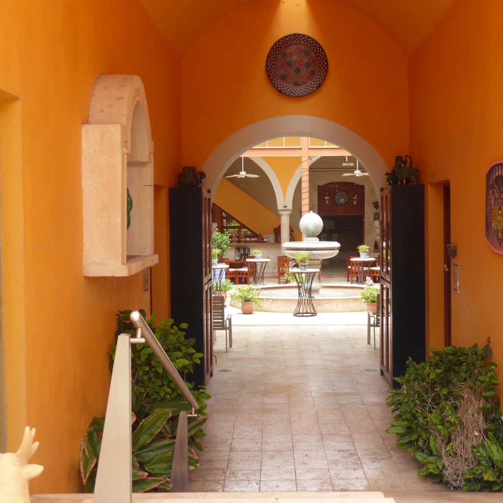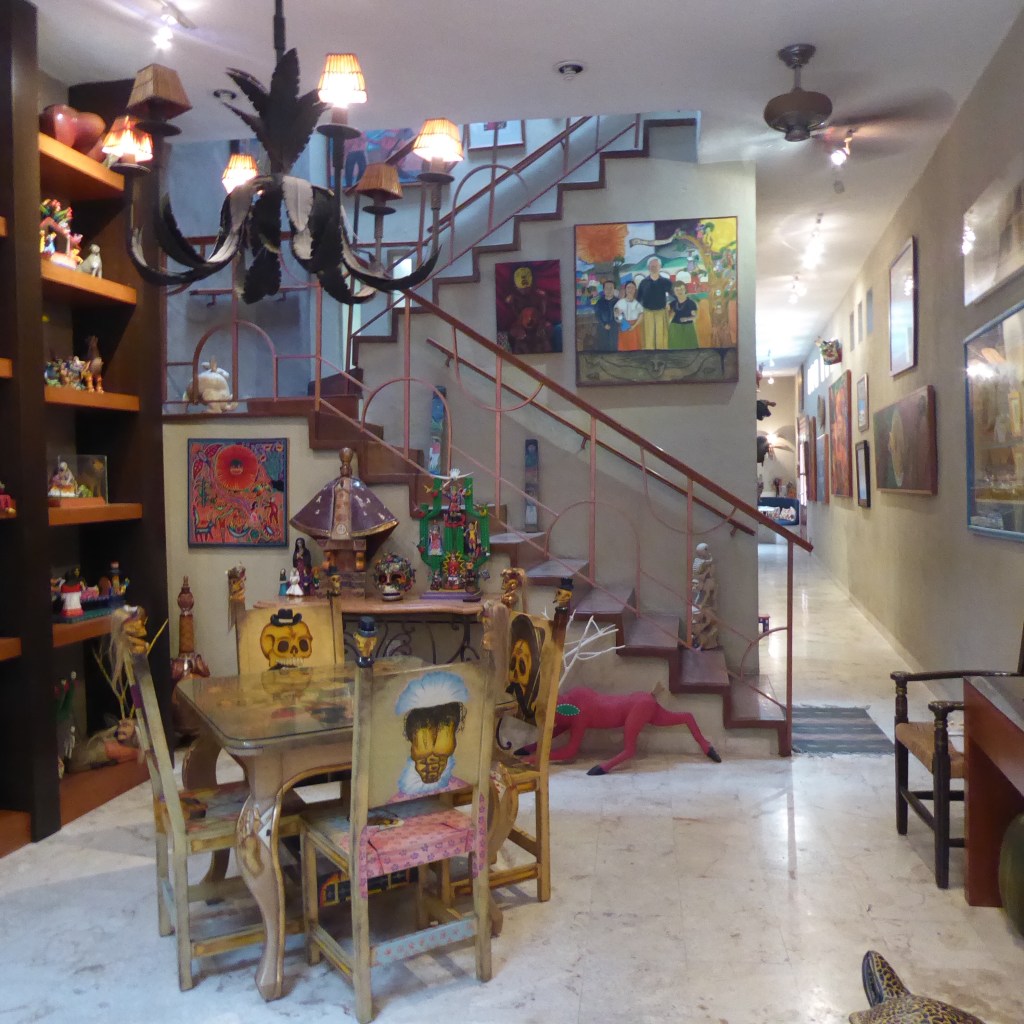 This is the entrance from just off the street. From a street vantage point, you would swear you were entering a parking garage, a hostel, maybe, or a very modest home. But inside is a palatial compound with 5 guest quarters, courtyards, pools and more more more folk art. There’s 18,000 square feet of house, displaying 3000 pieces of colorful folk art, gathered by John and Dorianne Venator, from Portland, OR, and Chicago, IL, quietly living out their lives in charming Vallalodid.