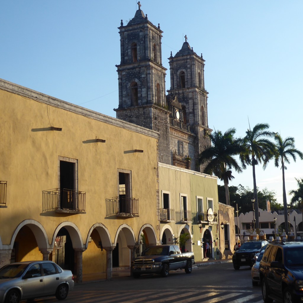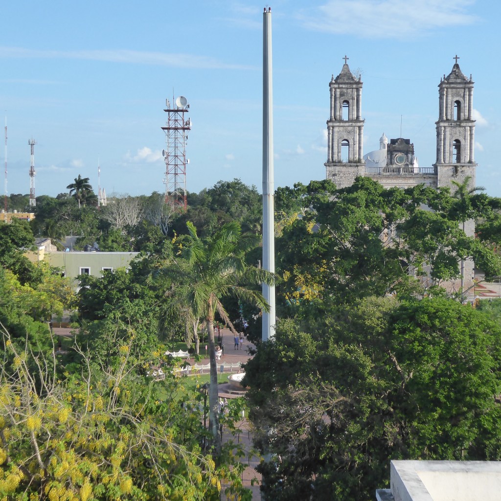 We have arrived in Valladolid! This is the view from our hotel room at El Meson del Marques, where we booked their Grand Suite for $150 a night. The room is a large, tiled-floor affair with about 500 square feet of balcony, overlooking the main square and the church. I was pretty awestruck until I saw the entry/exit for the bathroom and realized that a focus of our stay will definitely be reminding Ron not to “fall out” of the bathroom and I can report that, as of last night, he had made his premiere tripping performance and is sporting a nice cut that looks to have wrecked the bed sheets. I’ve added a nice ottoman to the garbage can, in hopes of drawing his attention to the step for today but it pains me to do so because one of the things that makes this room a “suite” is that there are TWO tweezing stations: one in the bathroom and one in a nice lobby area and I had to give up the lobby tweezing station ottoman to help block the bathroom but those are the things you do when in a relationship.