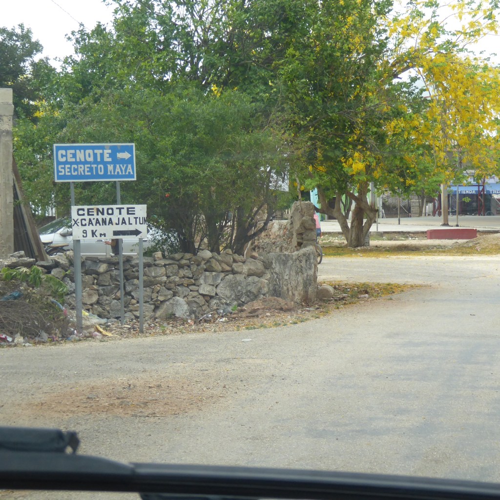 Now, back to the cenotes. We did indeed cover two today. The picture at the top is the second cenote and that’s me having the entire thing to myself. It’s called Xcanahaltun. These places are ingeniously run. This one is a private cenote. We paid an entrance fee of about $10 and we get access to a bathroom, a changing room and the cenote. There was no one else there with us. Daniel says he found this place on a scouting mission and thinks it’s really special. We drove about 30 minutes from Ek Balam and, en route, we passed dozens of other cenotes. The roads are littered with signs like this: