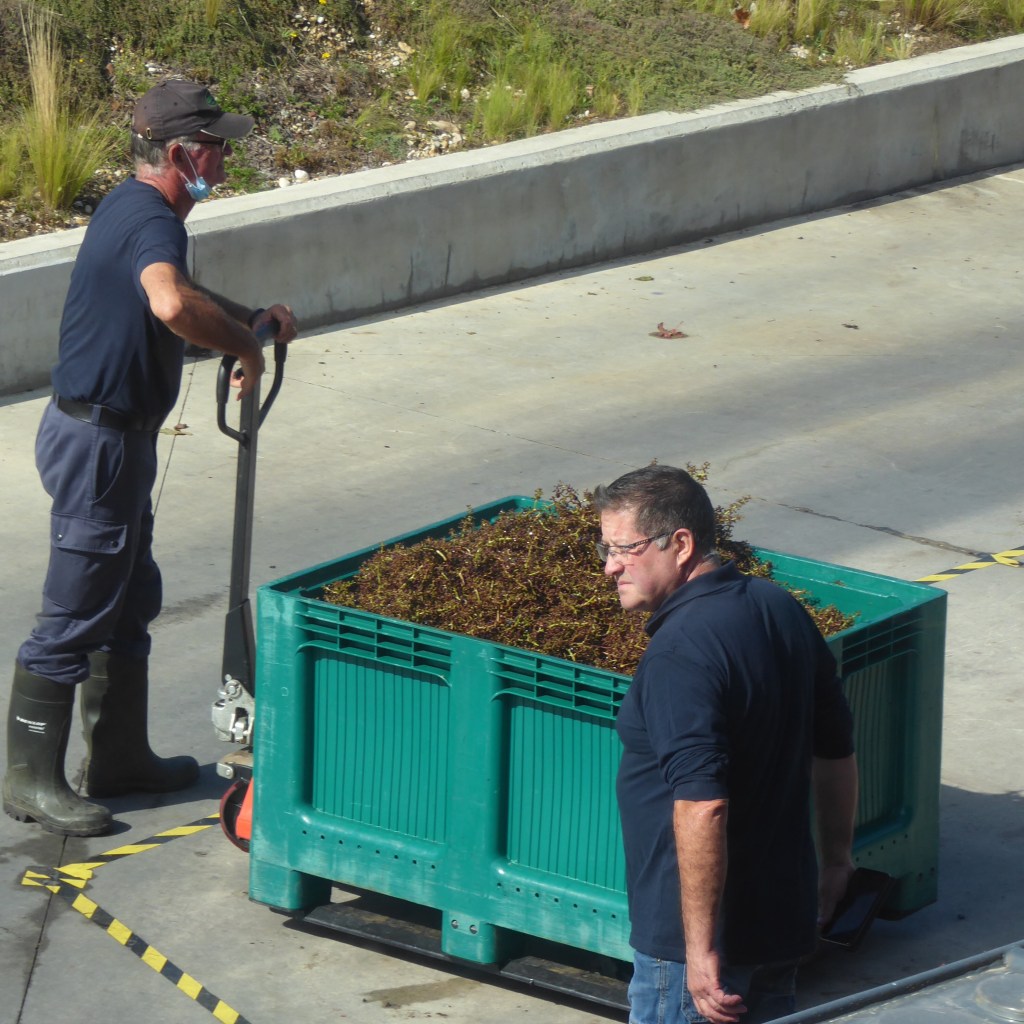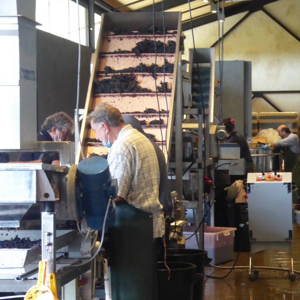 And since we are here during harvesting time, we got to see the employees in action, hand-sorting the grapes. The guys in the second picture have gathered up all the stems to make into mulch. Not visible in these pictures is Ron, bending down nearby to grab himself a loose grape, which has got to be a code violation of some kind.