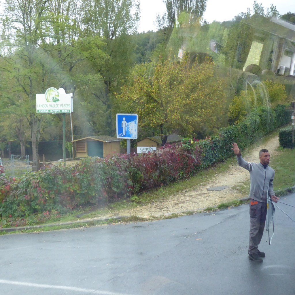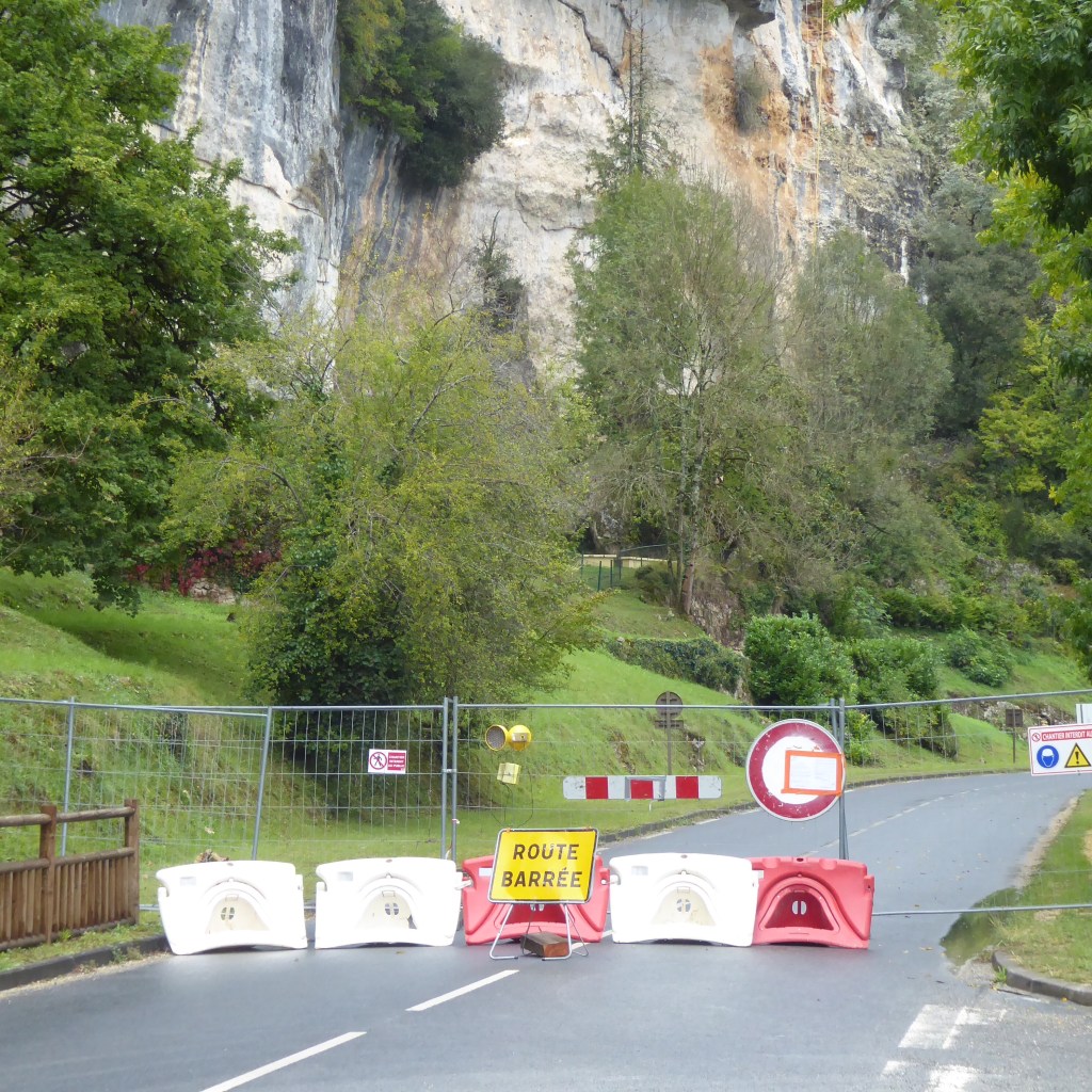Approaching a bridge on our tiny French road somewhere in the middle of nowhere, that construction worker (see him for yourself right above) told us the road was closed ahead and we needed to go around and so off we went. Around. It was a lovely meandering hour and then we came to a stop, exactly where we started, having discovered, together, as a group of Road Scholar explorers, that you cannot go Around. This time, though, the French Construction Worker was not present – on break, having a cigarette, looking the other way or in the bathroom – and so our intrepid bus of 19 – 5 walking with canes and 14 walking without – we “explored” past that road block – undeterred, probably just like Cro-Magnon Man discovering the cave – because we really needed to get to lunch. And it was funny, because we did come to the actual blockage – which was exactly 10 feet further than we needed to go to park the bus and head up to lunch: