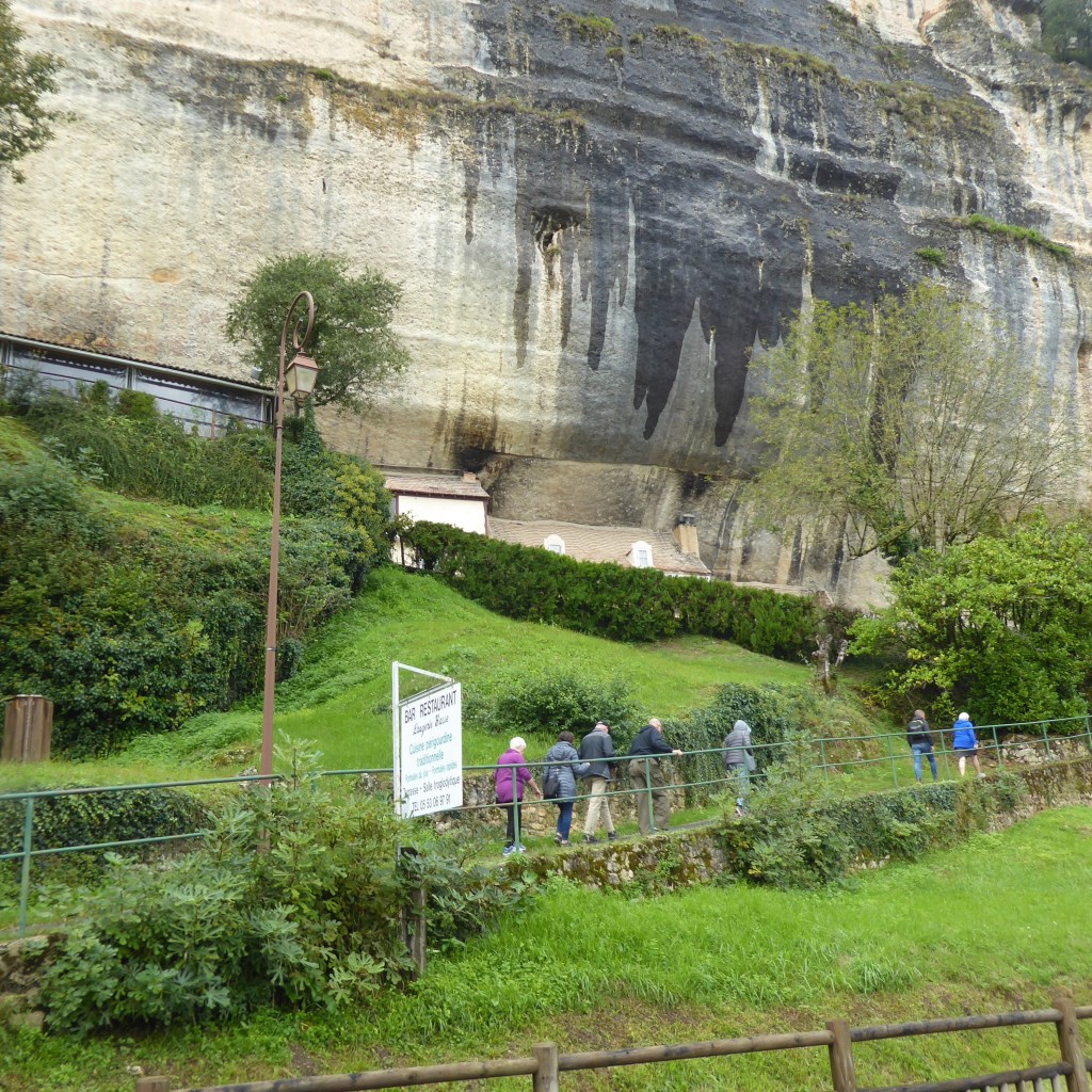We were taken into the cave on a little train that would never pass any OSHA regulations in the US – and driven a mile in the dark feeling exactly like we were on the best Disneyland ride ever (except no seat belts, shoulder belts, sides to the train, sufficient safety lighting or safe alternate exit system), where we got to see the cave art of the 17,000 year old dwellers. Our guide had a perfect combination of unlimited English language skills and overwhelming French accent, so he spoke liberally and expressively to us in English and yet we gained little information. He continuously apologized for his very strong accent and so polite behavior dictated we not try to clarify any of his speech. He lectured extensively about the Care Bears of the cave and our little train of 19 Road Scholars (6 PhDs, 5 attorneys, 2 retired CIA employees etc.) tried and tried to figure out what he meant. (For you traveling behind us, it’s a Cave Bear he’s talking about, but I still don’t know why.)