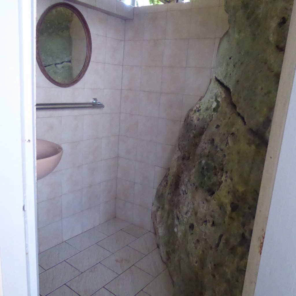 I’ll leave you with this bathroom picture (Sorry, SDS, I know you hate these, but no toilet visible!) from our lunch restaurant, built into the hill. They certainly have embraced the idea of respecting the existing landscape with their architectural plans. Look at that tile cutting around the rock!