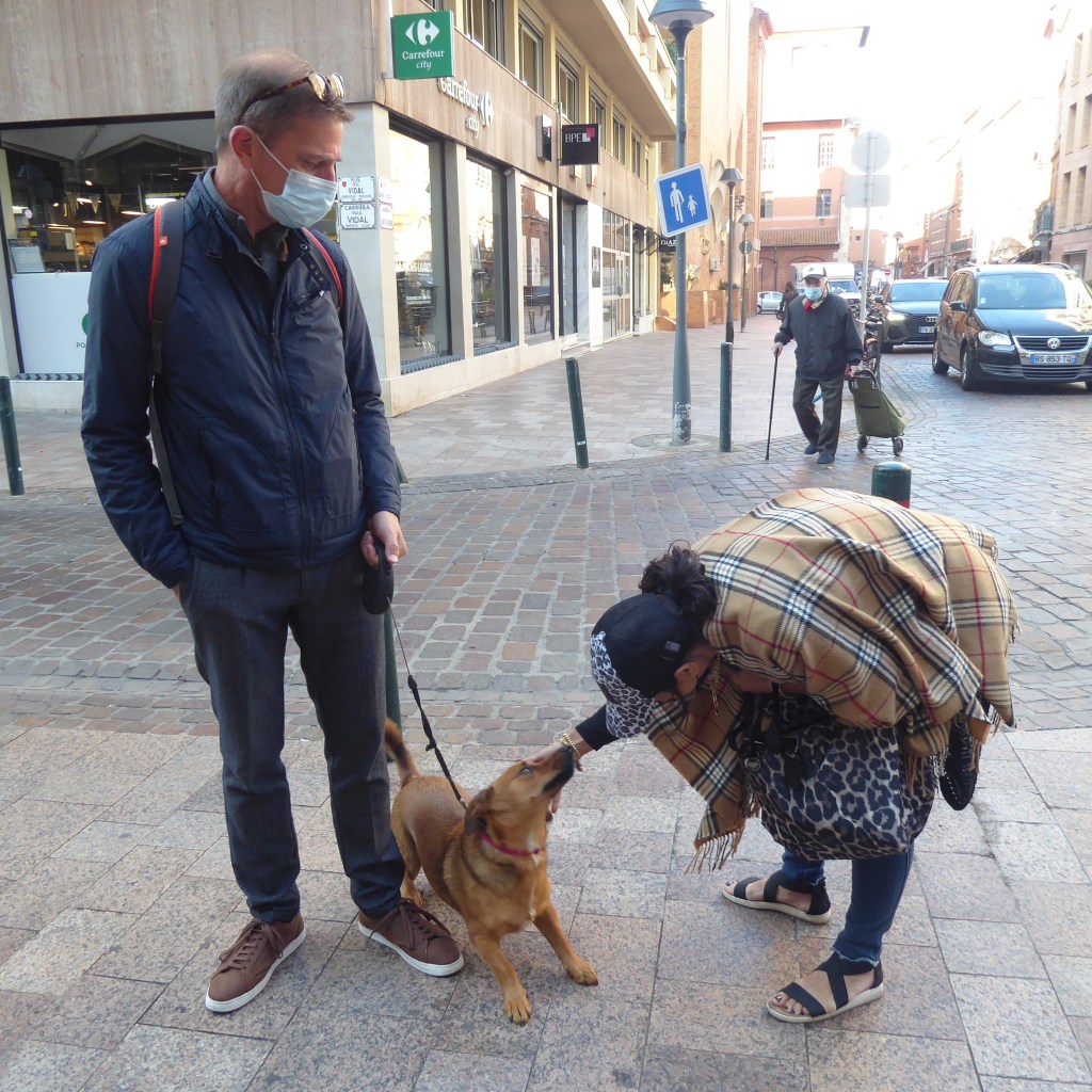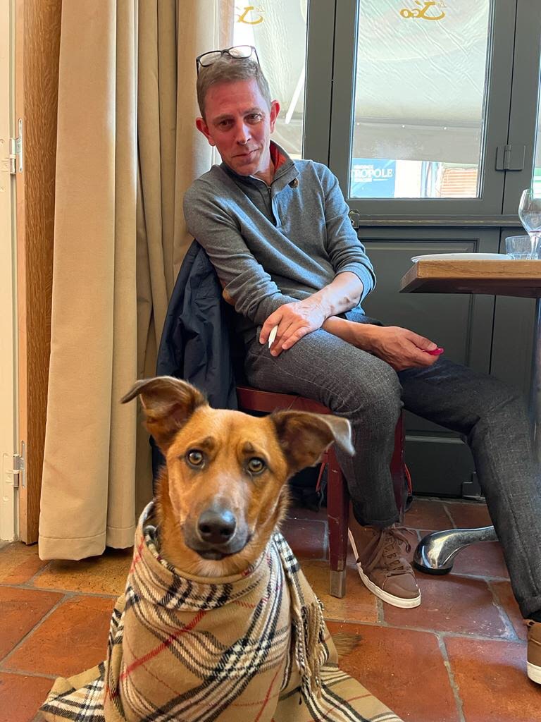 Above is the initial encounter between Sam and Tom’s dog, Skip. Look at that body language – smart assessment, Skip! I have to give that dog bonus points for correctly gauging Sam’s ulterior motives and trying to get some distance from Sam. Below is poor Skip – just a few hours later, looking gravely concerned – renamed Jean Luc and dressed in (hopefully) fake Burberry. Bonus points, also, to Tom, for not kicking Sam off the tour.
