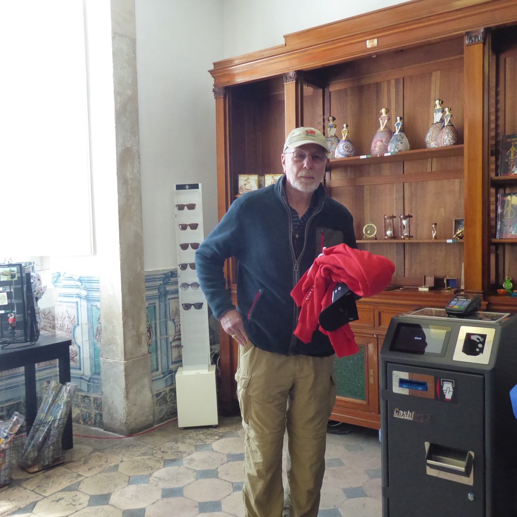 We’ve had our final day in Portugal and it was a fine example of how much more we can accomplish when I am not in charge of the GPS. We started with a drive south to Coimbra, to see the university. In existence since 1290, it’s been in Coimbra since 1537. Ron fell so in love with the academic grandeur of the place that, while I was in the bathroom line, he purchased both a sweatshirt and a hat to add to the fruits of our do not purchase anything edict (Birkenstocks, t-shirt, tights, umbrella, sweatshirt and hat).