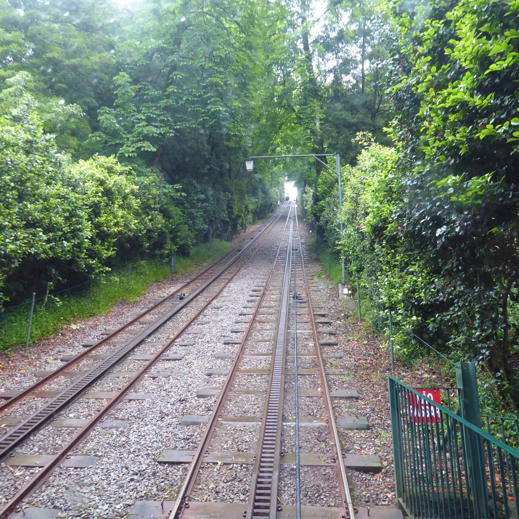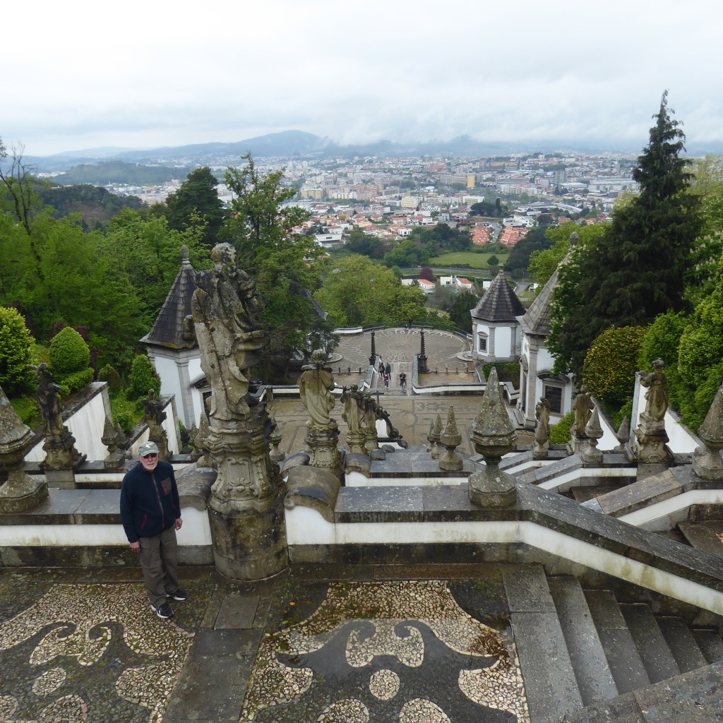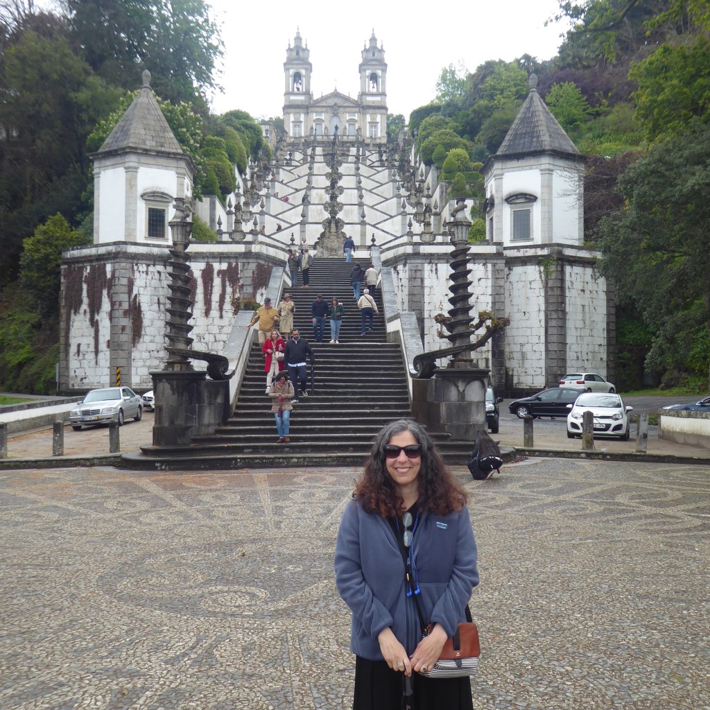 Before I start telling you about Spain, I need to add that we stopped briefly in one more Portuguese city before we drove east – Braga, in the far north, known as the religious capital of Portugal. Braga is famous for its Bom Jesus do Monte complex, with a church at the top and a Baroque stairway that depicts an ascent to heaven. Above is me, walking down the 577 steps after taking an upward ride on the oldest water-powered funicular in the world: