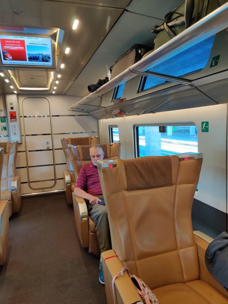 We made it to Rome! One of the things I was excited about was the train ride between Venice and Rome. I had booked some new train class I researched called “Executive” class, based mostly on our experience in Spain, where the train seats are pretty tight – and Ron ventured out away from me to try to find more space and got evicted by the train porters. Here’s Ron enjoying his seat. There are only 9 seats in the entire car: