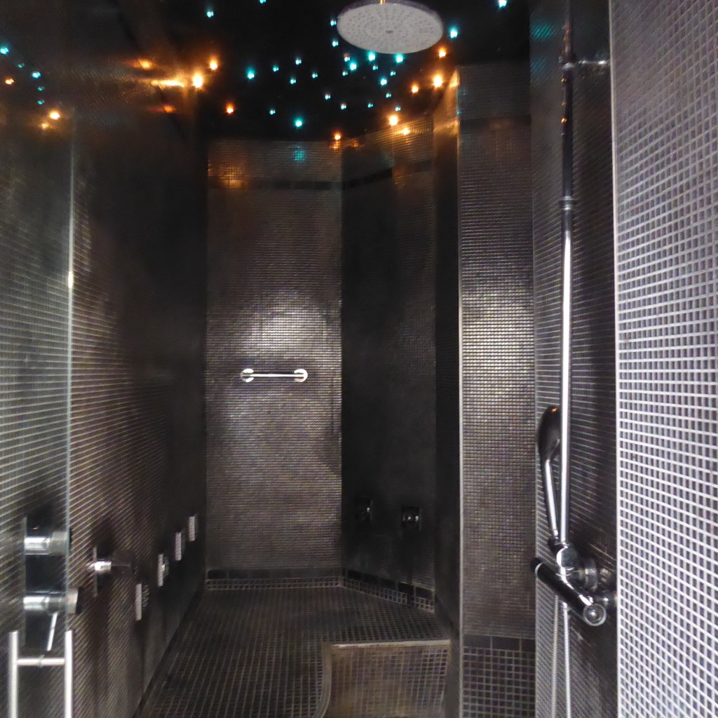 We’re heading out on our first day of touring so the only real touristic thing I need to show you at this point is the shower in our hotel room, which is extremely cool in a 1980s disco lounge sort of way, but does not contain any actual light-emitting lights: