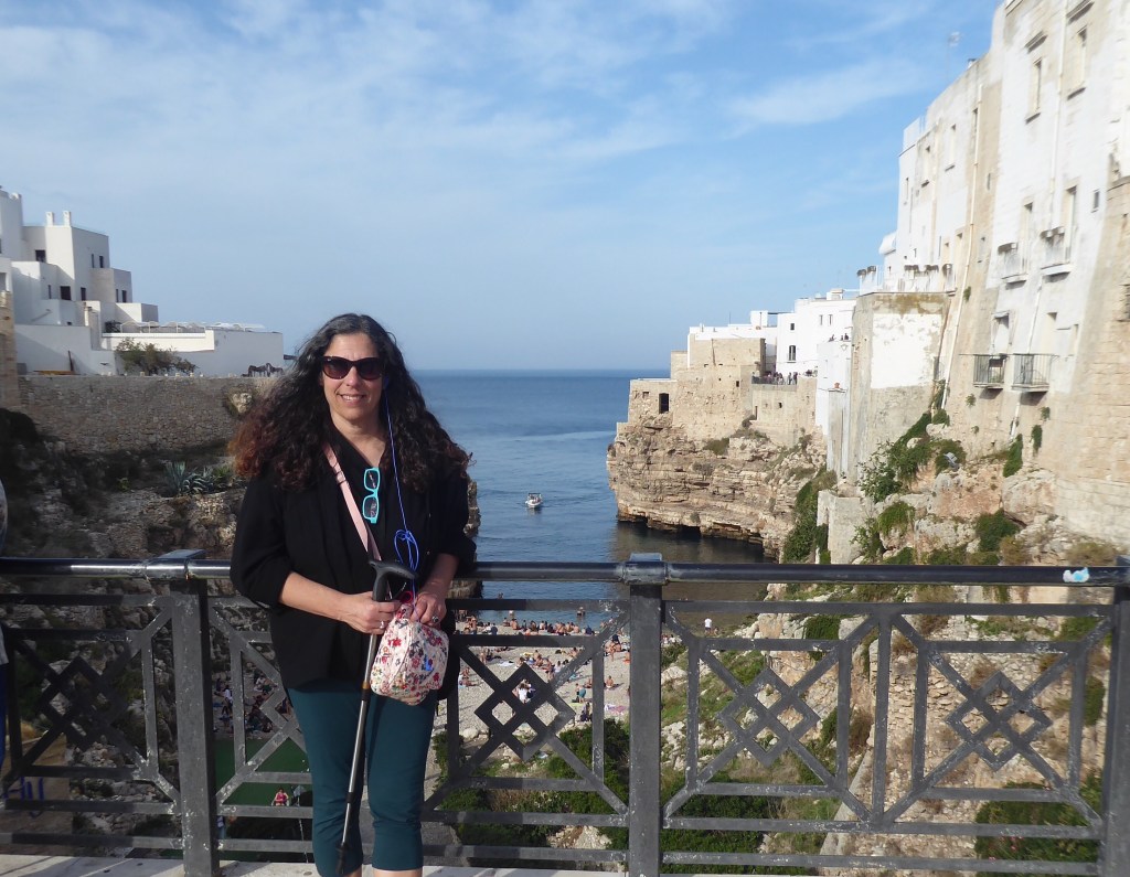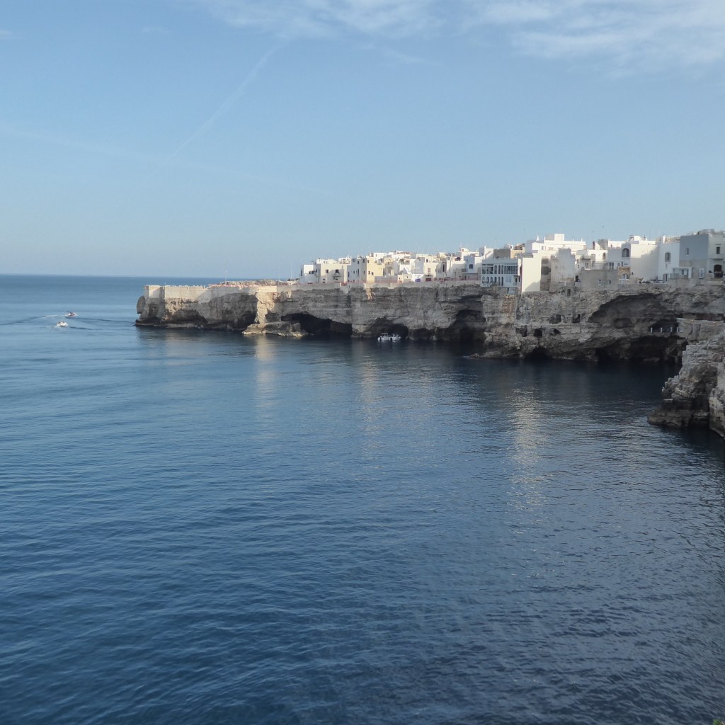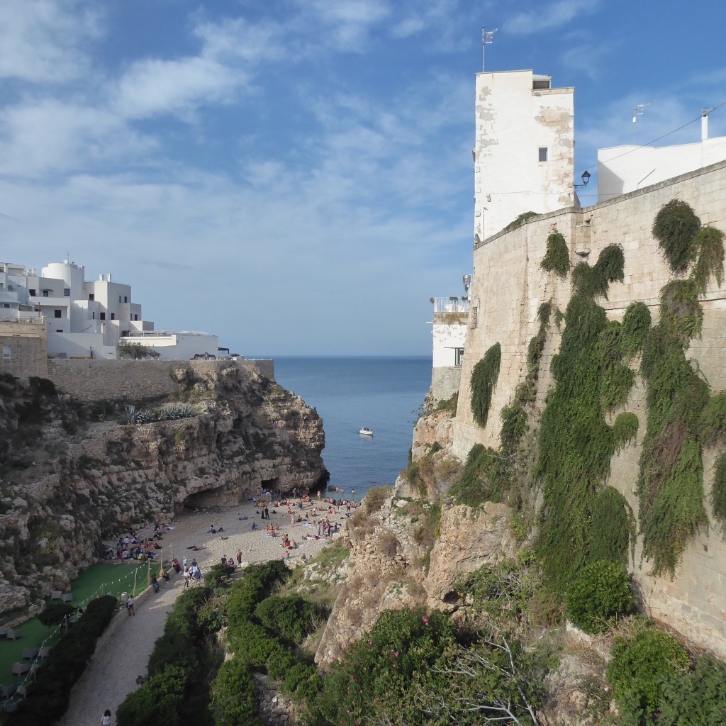 Today we went to Polignano a Mare, mostly to see the gorgeous sea views on the southern Adriatic coast. All three pics above are from Polignano. While we were en route, we were stuck in traffic from a car accident…the kind of accident where the freeway becomes a parking lot, and people get out of their cars and amble around on the road like it’s a Venetian piazza.