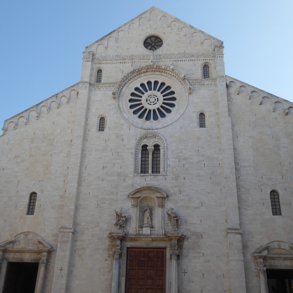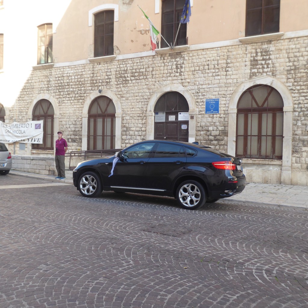 I should clarify that we came to Bari to see something in a Basilica – Basilica of Saint Nicholas – from 1197. It’s a pilgrimage site etc. etc. etc. with a cool BMW parked outside and a wedding going on inside, which was especially nice because that offset the FOUR funerals we have walked through in the past week. Here’s the Basilica and Ron, pondering it all.