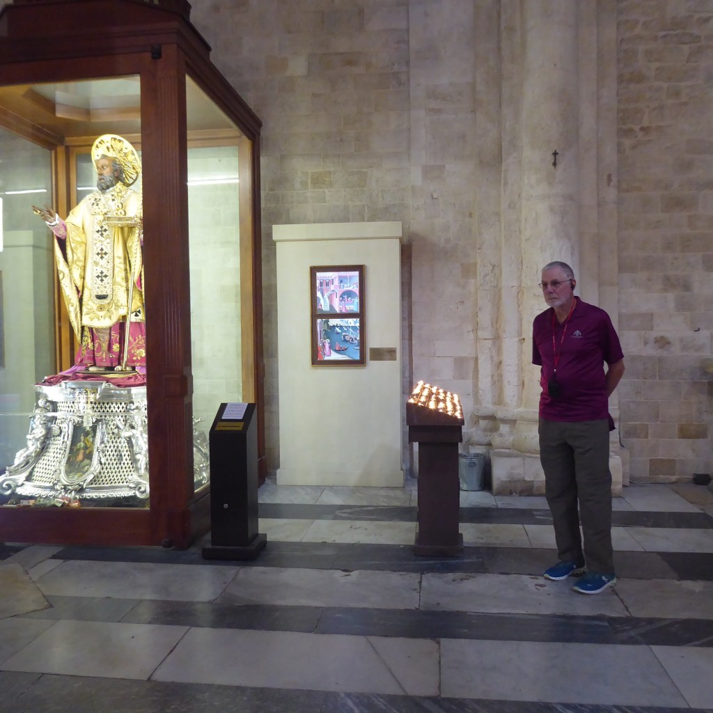 I’ll leave you with Ron and St. Nicholas, from Bari, both pondering the same pilgrimage or, maybe, watching me try to pick up the soap in the shower.
