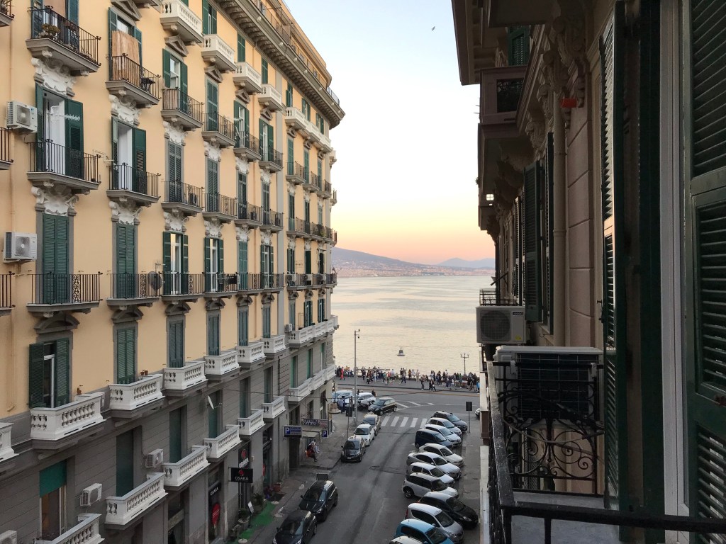 Both of these sites were absolutely empty and we walked around in awe that we were allowed to just stroll around these 2000 year old mansions alone. And it was quite a contrast to Naples, where we were just dropped off. Naples is nuts – the driving is outlaw/vigilante, there are swarms of people, horns honking constantly. Here’s the view from our final Italian hotel window: