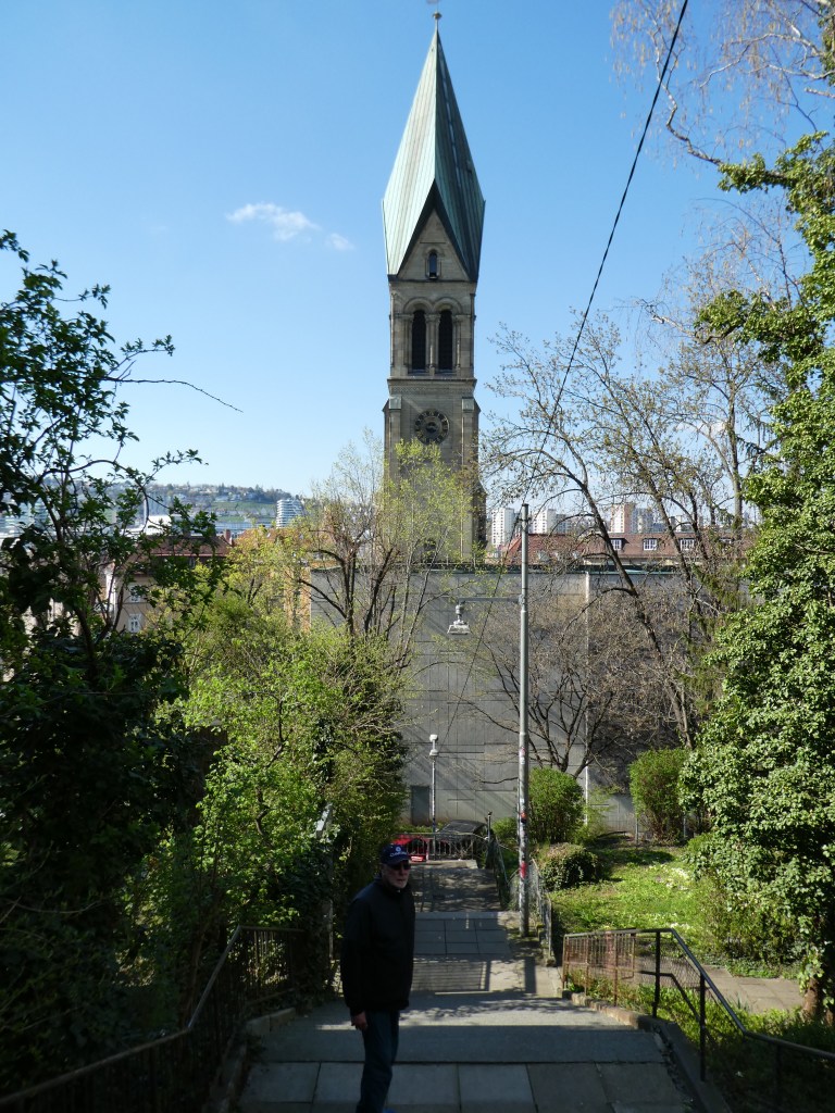 They lead from a nearby park up to our lovely Stuttgart hotel – Le Meridian. Every time we walk up, Ron informs me that the little mini steps off to the right in this picture are designed for easily rolling your luggage and numerous requests to defend his theory have been met with silence. If any of you agree – or can offer the actual use – please weigh in. I say construction design is not Ron’s strong suit, but he sure knows how to enjoy a doughnut: