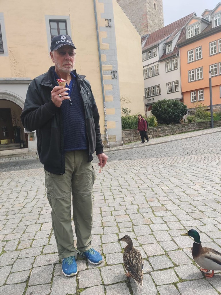 We also came across some stellar ice cream here – small batch, unusual flavors, and, as we sat and ate, these ducks stalked Ron, who is, as ever, unfazed by birds near him in stark contrast to me.