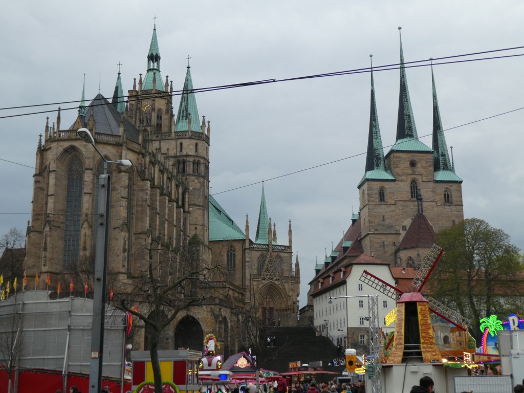 Sometimes I just walk into a city and fall in love. Erfurt is one of those cities. We’re here for a quick stop to see a WWII museum, but we wandered off from our hotel and came across these two dominating buildings on the main square. St. Mary’s Cathedral is on the left – from the 14th century. Martin Luther was ordained there in 1507. The church on the right is St. Severus – from the 12th century.