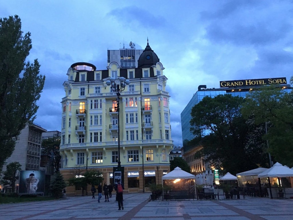 Here’s another cool shot. It’s the Baron Gendovich house, which is just an office building now, but it’s considered the first “skyscraper” of Sofia, built in 1914, and makes it clear that the architect of that skyscraper had not seen much of other large city skyscraper offerings at the time. The Grand Hotel Sofia, off to the right, is our tour hotel. (Pic not mine)