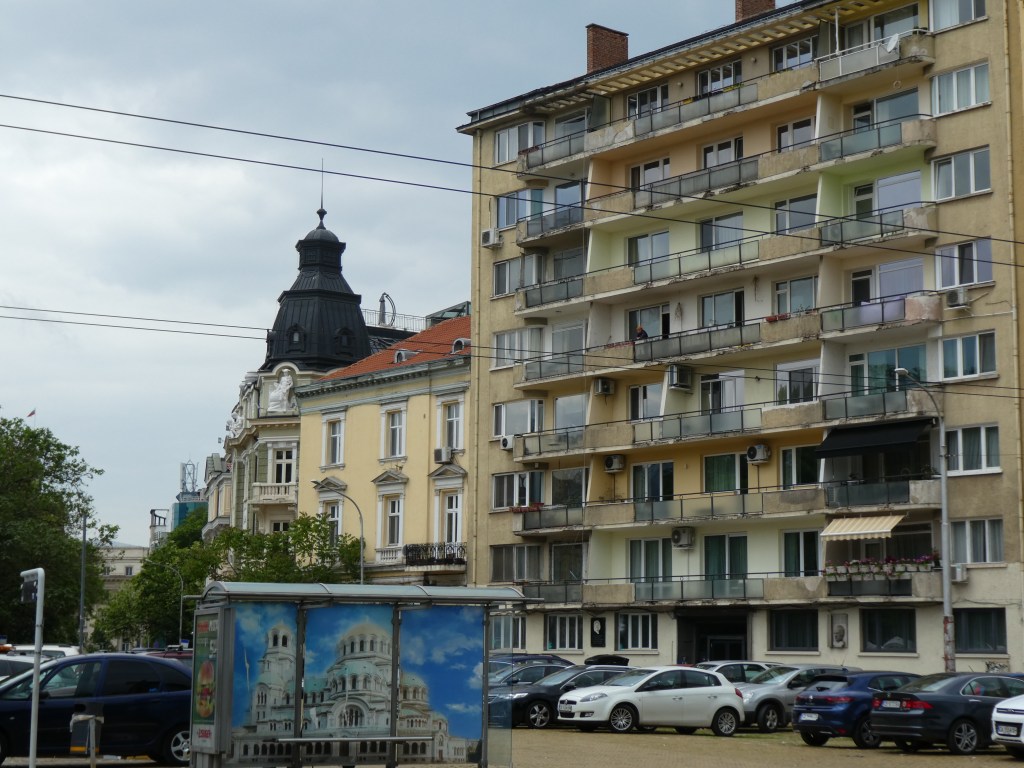 We had an initial walking tour through the streets of Sofia. It’s an excellent mix of architecture. Below is the St. George Rotunda – oldest building in Sofia, from about 400 AD – surrounded by more recent Brutalist architecture: