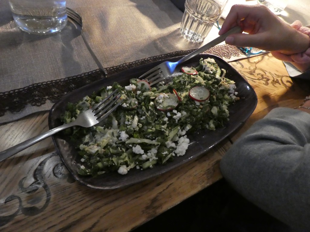One thing that Grace is just starting to grasp are the food issues I inevitably report to you. She – like most of you – is appalled when I report that we had dinner at McDonald’s. But by Day 3 of our Odysseys tour, she is admitting that she might be willing to join me at the Golden Arches. The problem – as always – is large portions of unidentifiable foods served late at night. Here’s an example – the dinner we were served last night. Here’s the “starter” salad, with my hand included for proportion.