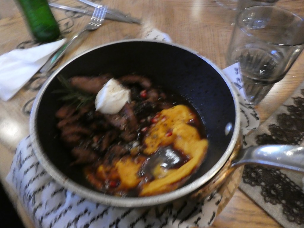 Here’s the “appetizer” chicken strips and fries, which Grace was pretty excited about until she bit into the chicken and determined that it was of seriously dubious quality – gristly, with bonus chunks that served as an immediate appetite suppressant. Following this, Grace was served a skillet full of duck. My photo really didn’t turn out but I’ll put it in anyways so you get the full flavor of the meal.