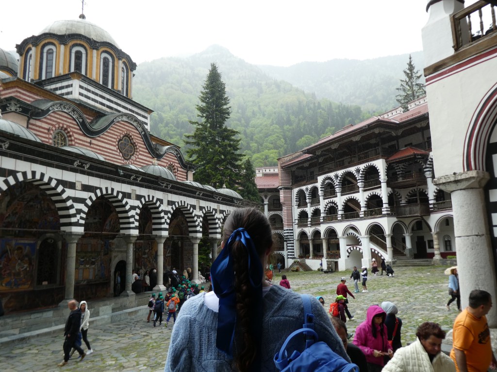 So while we enjoyed our tour of the Rila Monastery, we were simultaneously busy with trying to get Grace as close to a monk as possible. Through sheer parental determination, with some creepy stalking and fast camera skills, I managed to get a picture of Grace with a monk right behind her, so her dream was partially fulfilled even though she didn’t get to have her much-desired get acquainted with a monk conversation to ask him what he eats for breakfast. (Note from our research indicates they eat rice and pickles, which we may both be begging for after a few more really large dinners with heavily sauced meat products.)