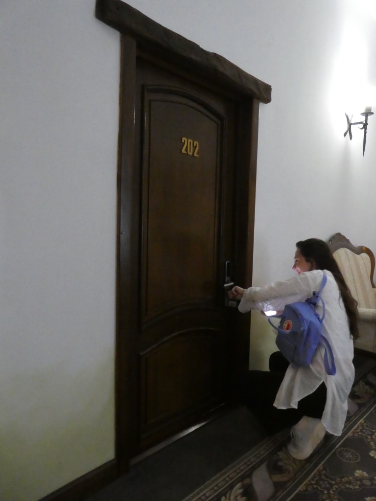 And here’s Grace, enjoying another unique benefit of our hotel room, as if the art and shower were not enough. The keyed entry area sits nearly at floor level!