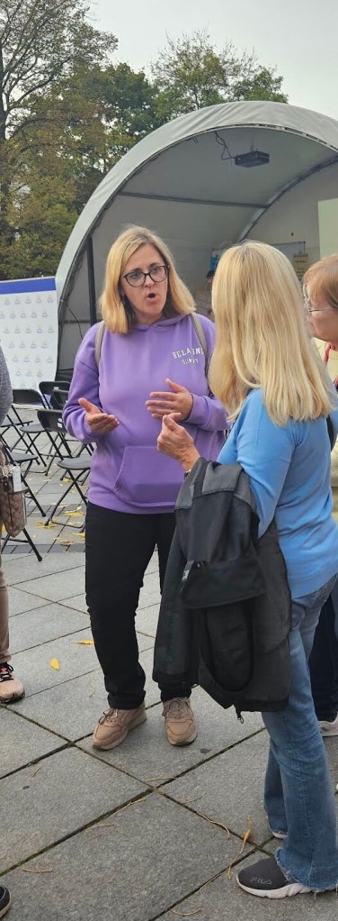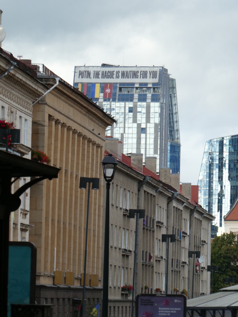 I have fallen in love with Vilnius. It’s a city of 541,000 with a terrible history of Soviet occupation that has emerged from that era as an elegant jewel. The living is fine here – so friendly, so clean, so safe. There is absolutely no honking, no blocking of intersections, and everyone yields to pedestrians. And here is how the Lithuanians feel about Ukraine – this banner is on the City Hall skyscraper: