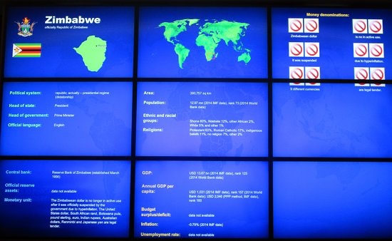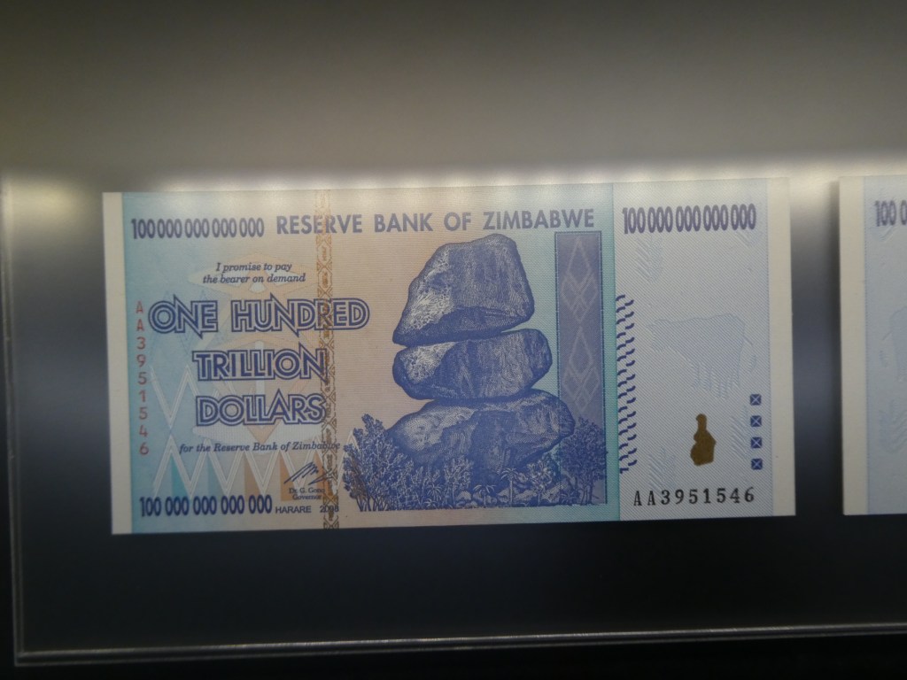 And then they had this bill from Zimbabwe, which makes our inflation look perfectly acceptable. This is a note from 2009, when inflation hit 230,000,000 percent, making this note worth about 40 US dollars. Zimbabwe retired its currency in 2009 and uses the US dollar now. One businessman reported that, by 2009, you had to pay for your coffee when you ordered it, but before you drank it. If you tried to pay after you drank the coffee? Well, the price went up while you were drinking due to the astronomical inflation.