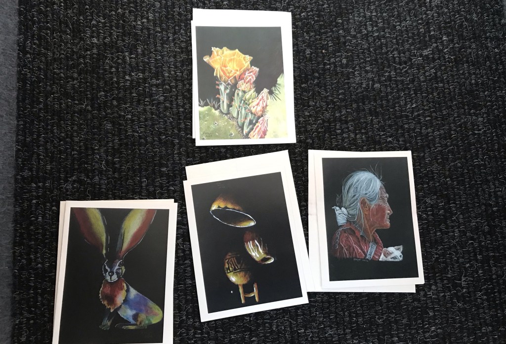 We’re quite the gifted OAT bus – we’ve got the machine gun expert, a quilter, Ron’s needlepoint mastery, and an artist who does colored pencil sketches of the most incredible pictures and is carrying greeting card minis (see below!) And also we’ve got a crochet-master – who is making me my very own scarf as I type this. Stay tuned for my scarf in an upcoming post.