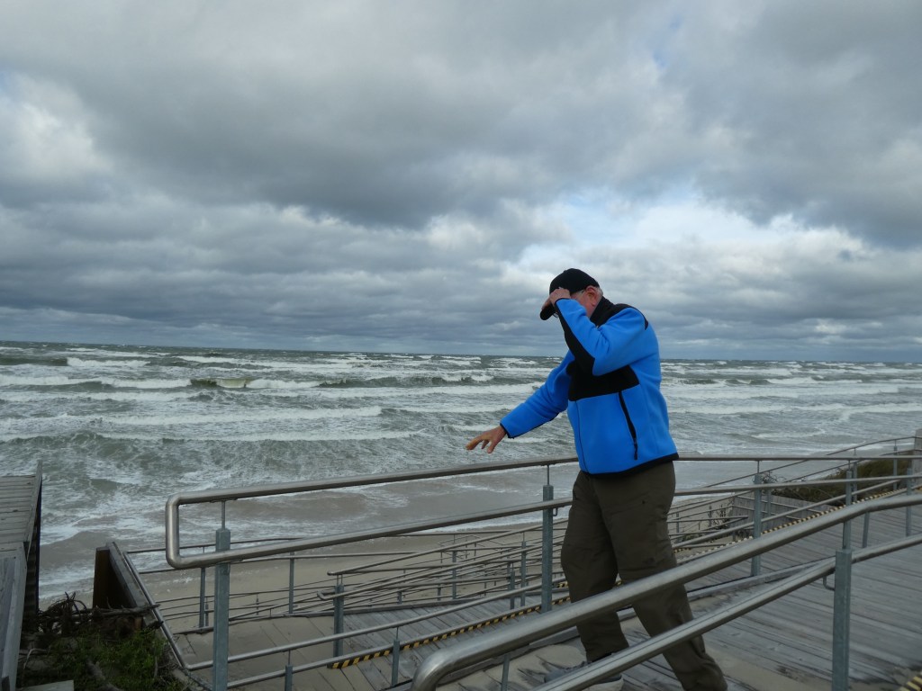 We went down onto the beach to check out the Baltic Sea and I was momentarily smug – thinking, hey, I’m such a traveler that I already saw the Baltic Sea this year but something didn’t compute because the Baltic Sea that I saw in Romania and Bulgaria in July was a lovely, placid Mediterranean-looking pool and here is Ron, trying not to be blown off the walkway and dragged out into that angry ocean.