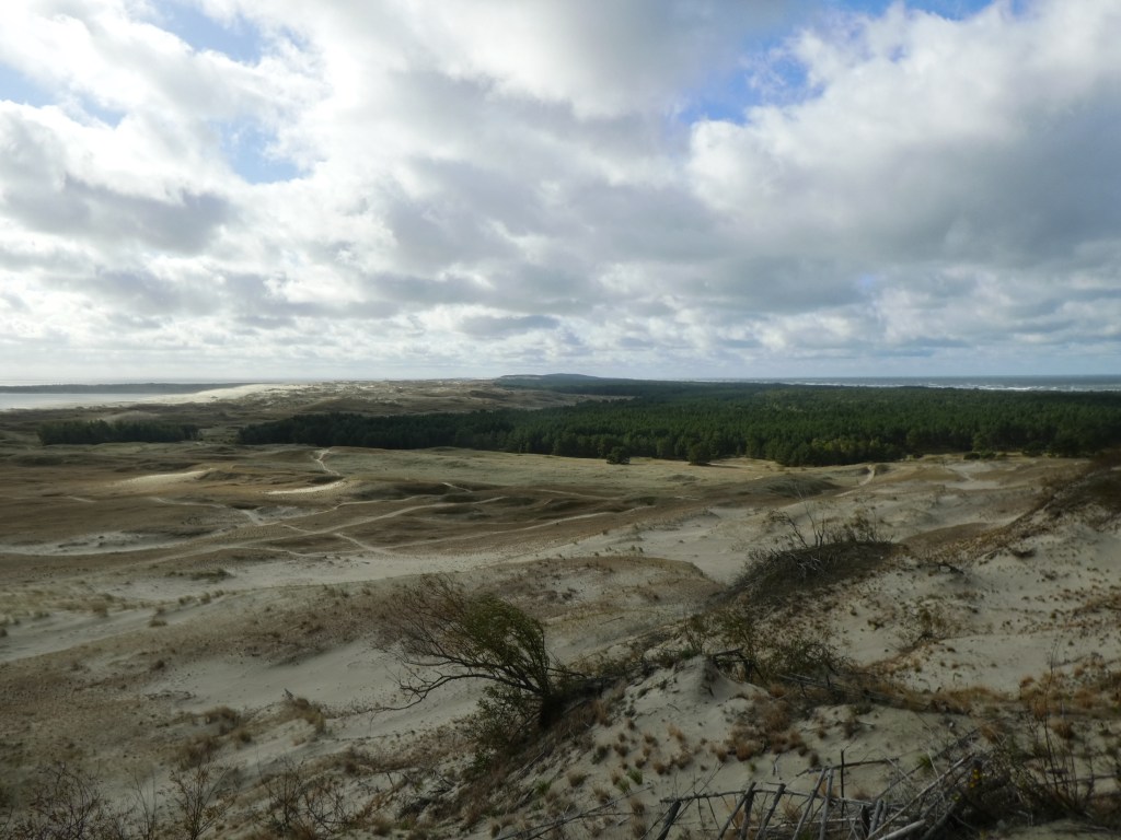 We did a day trip to the Curonian Spit, a 61-mile sand dune spit that is shared by Russia and Lithuania. I can promise you that we never got closer than 1.5 miles from the Russian border but Ron’s phone, as we know from its April solo trip to Paris, Atlanta etc., is an independent type and somehow got itself into Russia (see T-Mobile Welcome Note above!) even as my phone (much more timid) stayed squarely in Lithuania. Here’s our view of the border, with the trees you can see sitting in Russia: