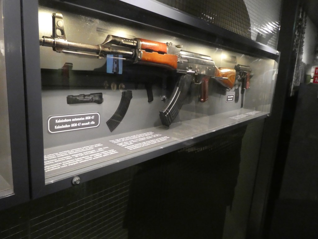 Pause here for this one semi-relevant story, so you call all get to know our amazing OAT guide, Aida, a little better. Aida tells some great bus stories – about current Lithuanian life, her family, life under the Soviet rule and more. And in one of our meandering conversations today, she revealed that – as a youth in the Soviet world – required to learn some soldiering in high school – she turned out to be quite gifted at assembling and disassembling Kalashnikov machine guns – 11 seconds for one and 13 seconds for the other, although she can’t remember which was which:) Aida was excited to see these guns at the Cold War Museum so we could visualize her talent: