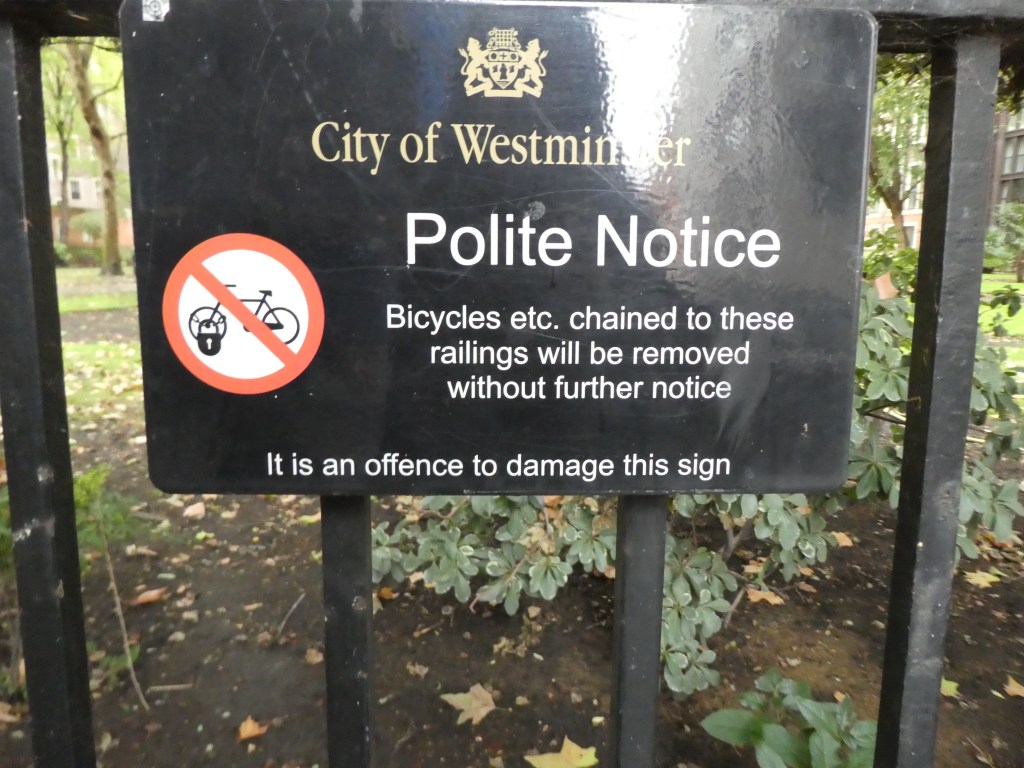 And then I liked this sign because it shows the well-mannered charm of British society. There’d be no “Polite Notice” in the US and I feel confident that any sign threatening an “offense” for damage to the sign itself would be covered with graffiti and profanity. This park was dotted liberally with these signs and they were all in this same pristine condition.