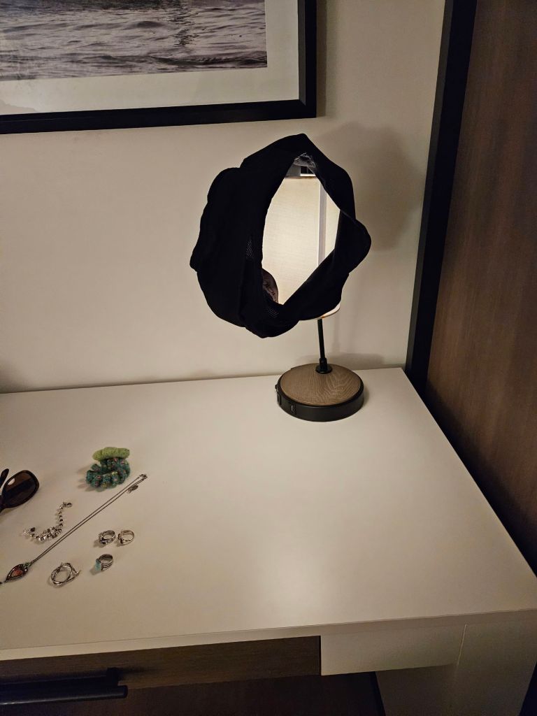 This Road Scholar trip is a series of one and two night stays, and it’s doing Ron in. Our travel route is littered with items of clothing he keeps leaving behind because we are unpacking and packing so quickly. Our extremely modest packing style (well, except for the Marshall’s bag containing the $500 of Patagonia fleece) dictates that we do a lot of laundry in the sink. And this works just fine on our Europe trips where we have 3 and 4 night stays. But even Ron’s special quick dry travel underwear is not working out, and Ron, ever-creative, has taken to this attractive drying method: