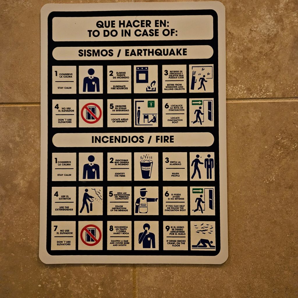I was also taken with this emergency sign at our hotel, with 9 contradictory steps for what to do in a fire, but no directive to fight the fire. (Compare to the 6-step instructions for the earthquake where they DO want you to fight the fire.) My unshakable morality requires that, if the fire stems from Ron’s attempts to dry his skivvies on the lamp, I’ll spring into fire-fighting action as if it’s a Mexican earthquake.