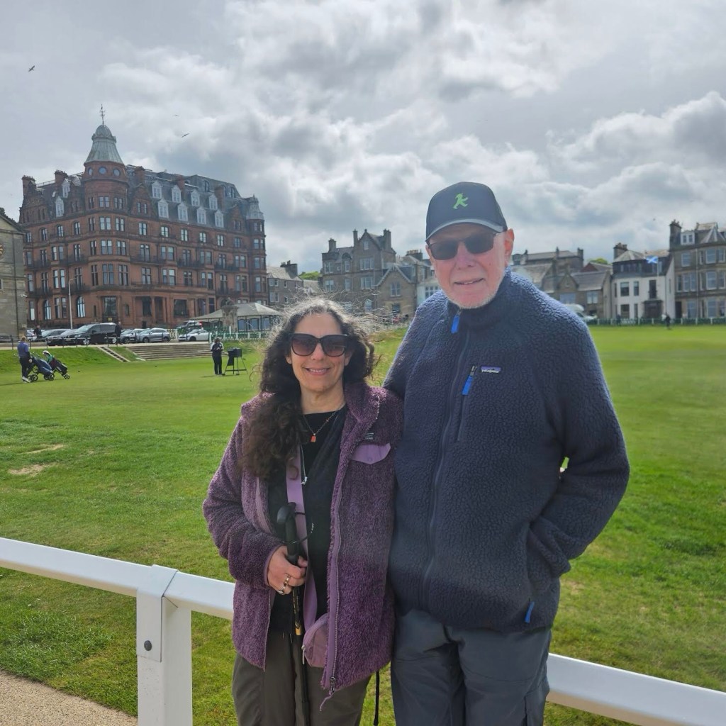 I drive most of our travel choices – the whales, stained glass, sewer museums, and endless buildings. Ron’s generally happy to come along. But for this trip, Ron wanted to go to Scotland and he wanted to stand in front of The Old Course at St. Andrews. This picture below is for those of you waiting to see if Ron made it out onto the greens at St. Andrews. It was a pretty thrilling moment – even for me.