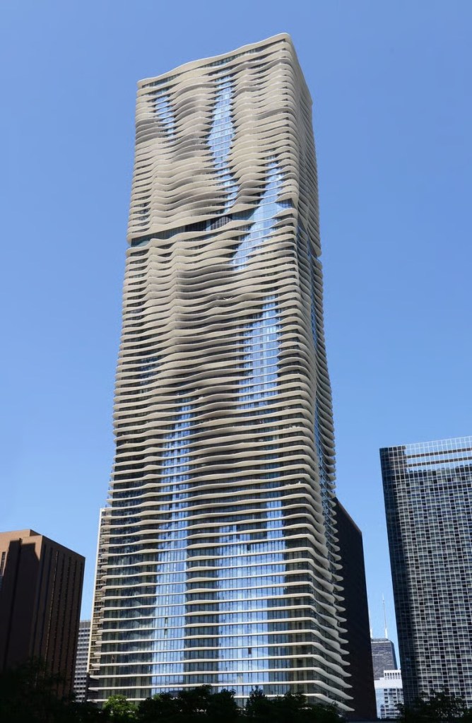 Here’s the 83-story Radisson Blu Aqua from 2009. The waves are balconies of between 2 and 12 feet, serving a functional residential purpose – but they also provide wind buffering and deflecting – protecting the building from too much sway.