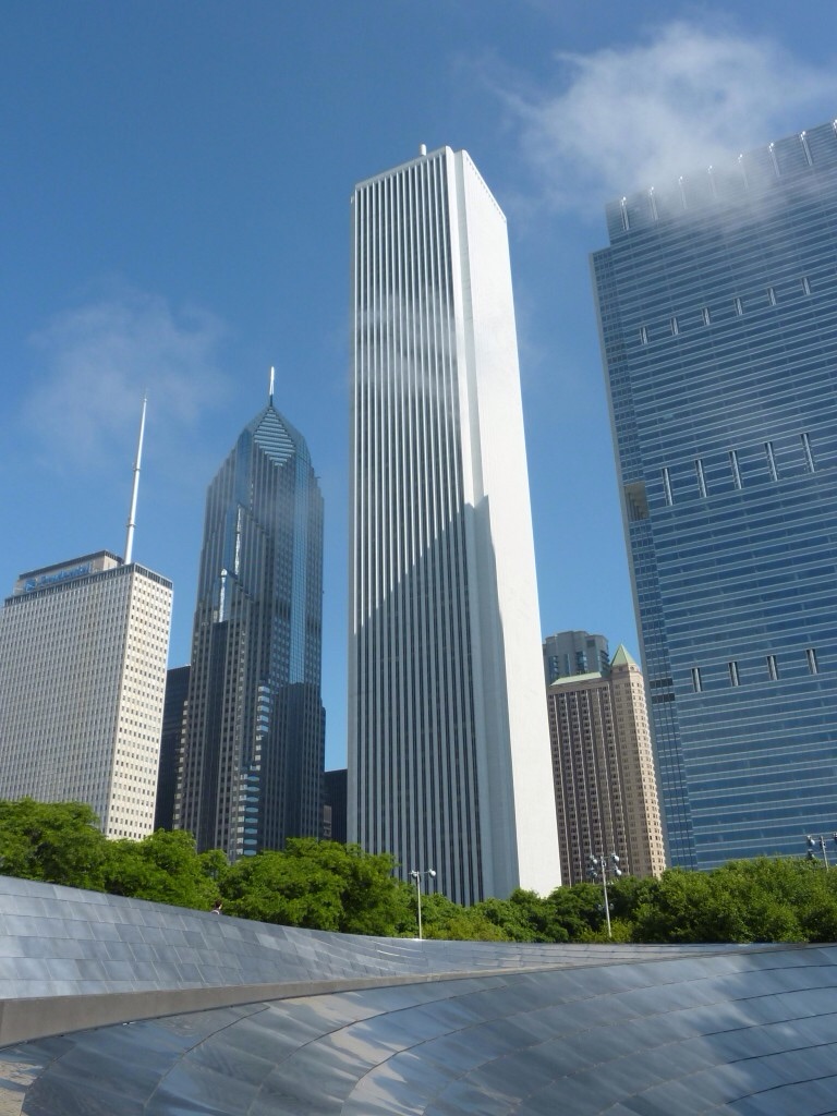 This one is the 83-story Aon Center, from 1973. It was covered in Carrera marble, which proved unsuitable for Chicago winters when the marble started cracking. The 120 million dollar building was then re-clad with granite – at a cost of another 80 million.